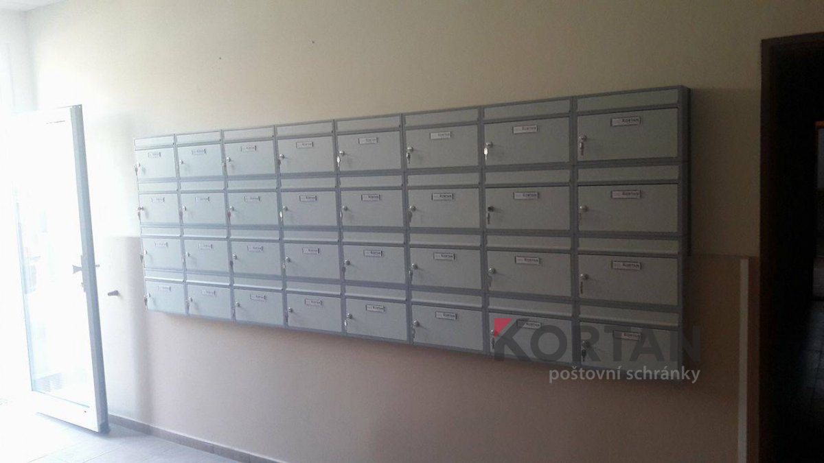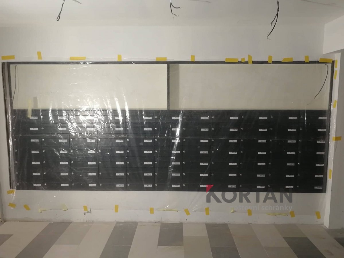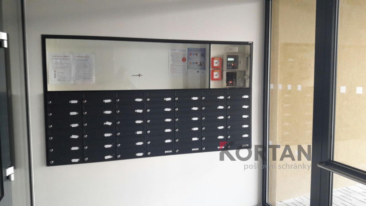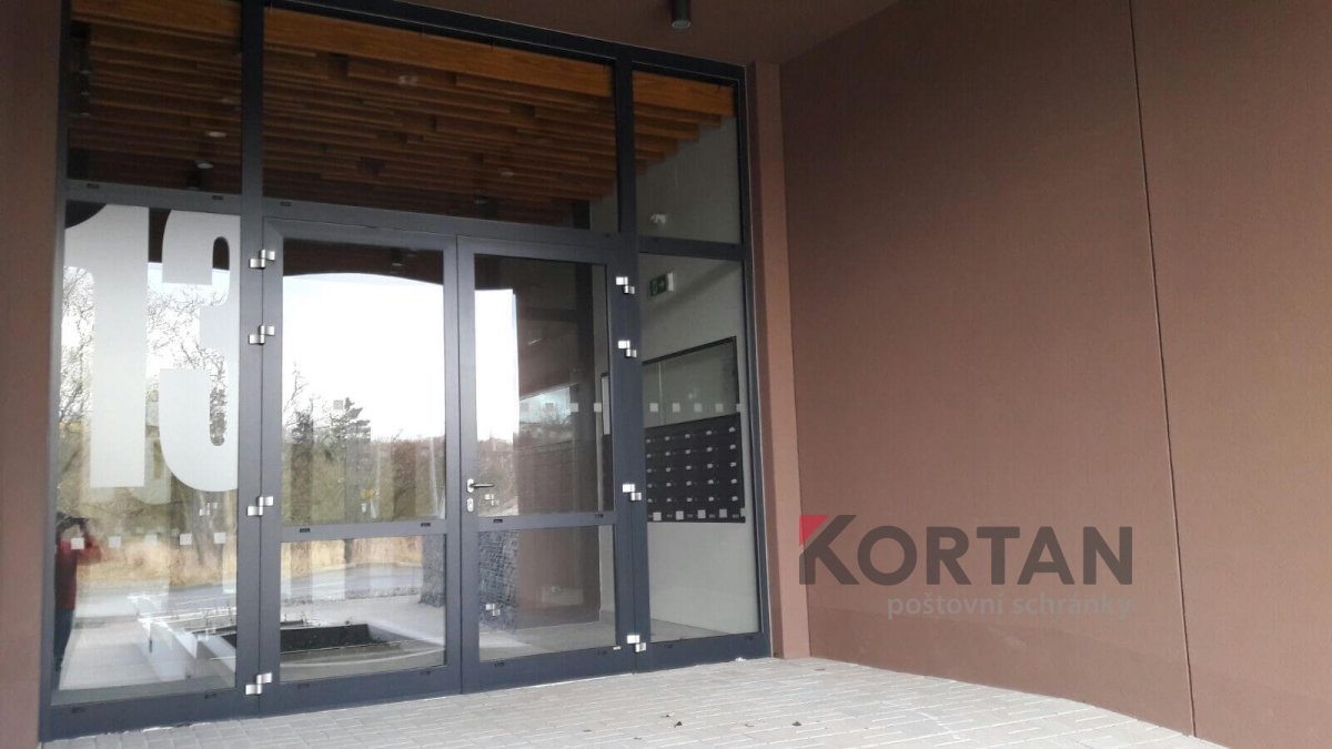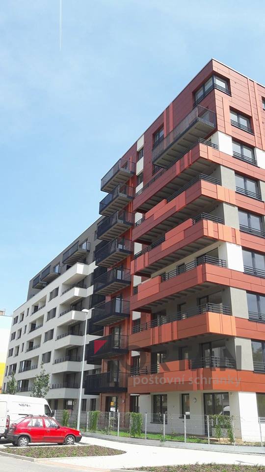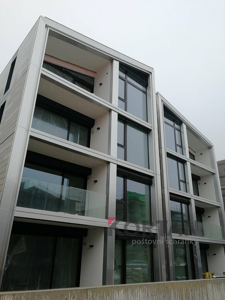 Popis realizace: V roce 2016 jsme uspěli ve výběrovém řízení pro realizaci sestav schránek. Vyrobili jsme sestavy schránek dle požadavků architekta a doplnili sestavy schránek o prosklené vitriny, které jsou vyrobeny na míru. Byla použita sestava poštovních schránek určená pro zazdění - použitý typ B-017 (370x110x265) v RAL 7016 matná nestandard, orámování celé sestavy Al L profilem 20/20/2mm v barvě 7016 standard. Sestavy schránek byly doplněny o vitriny s posuvným zasklením osazené zámkem. Vitriny slouží k vyvěšení informací obyvatel domu, zadní strana je tvořena magnetickým plechem lakovaným RAL 9010.