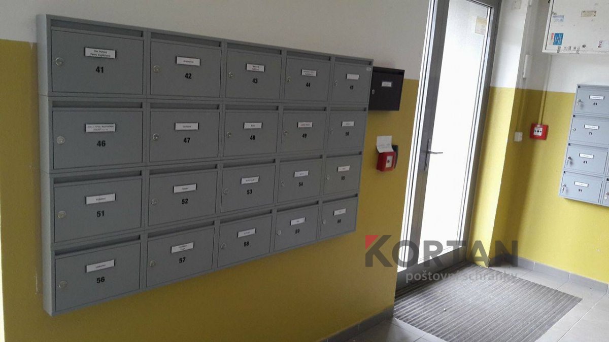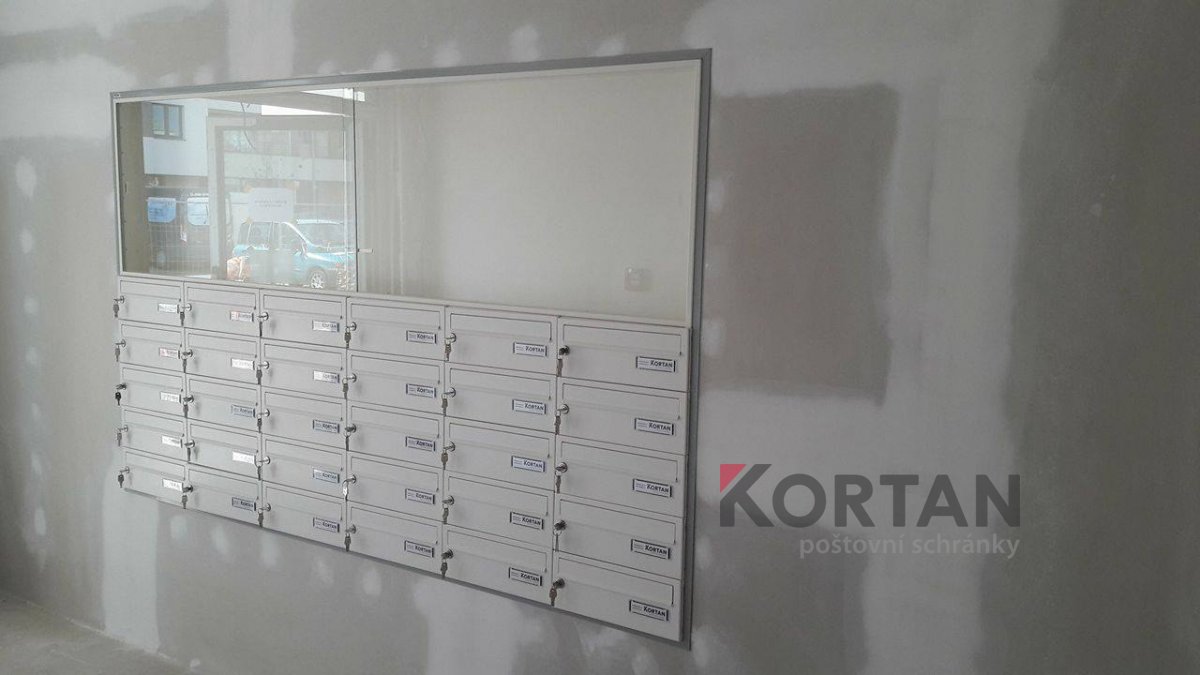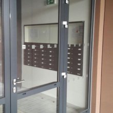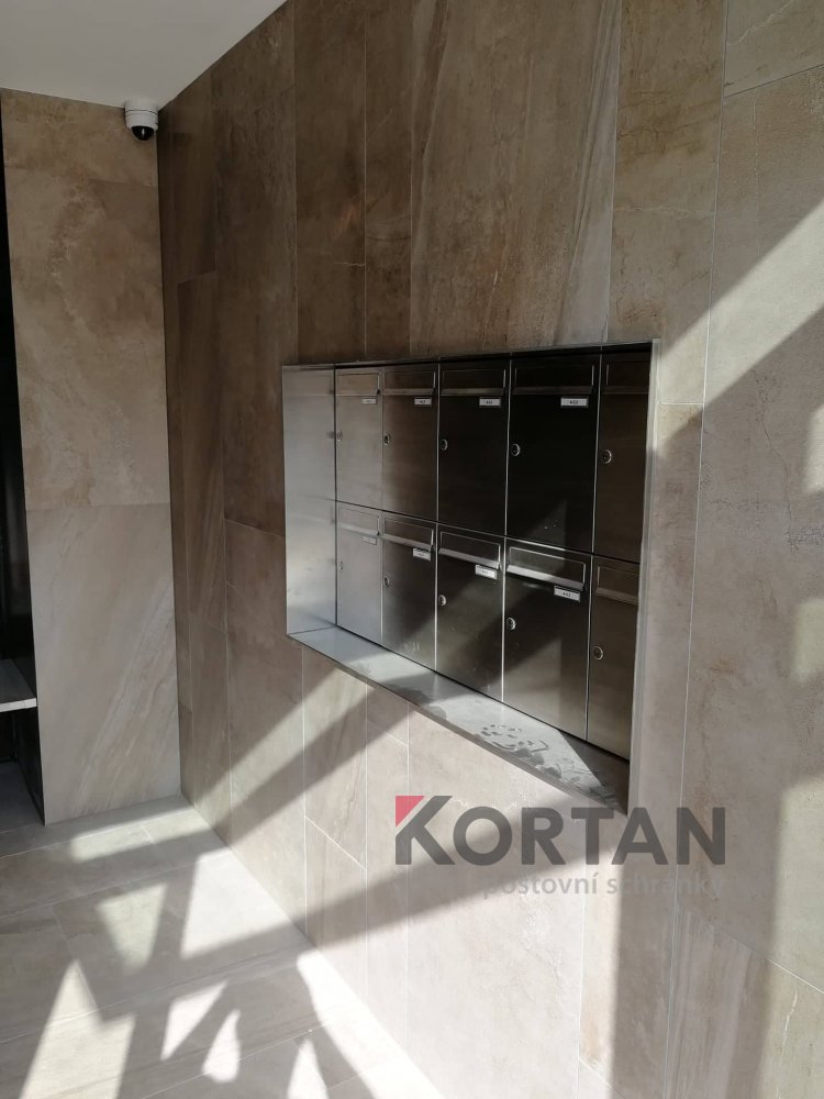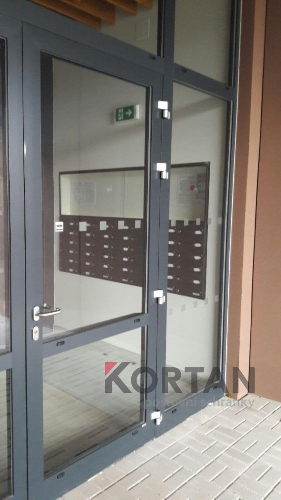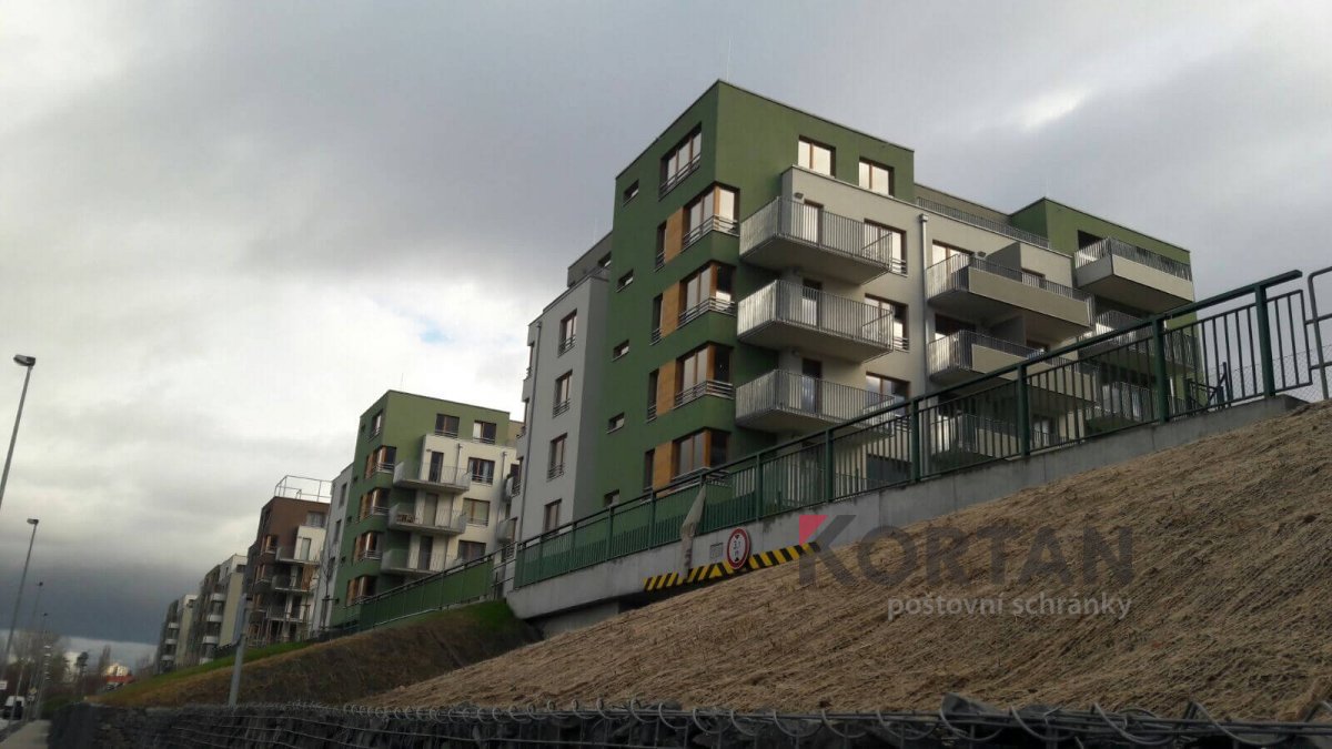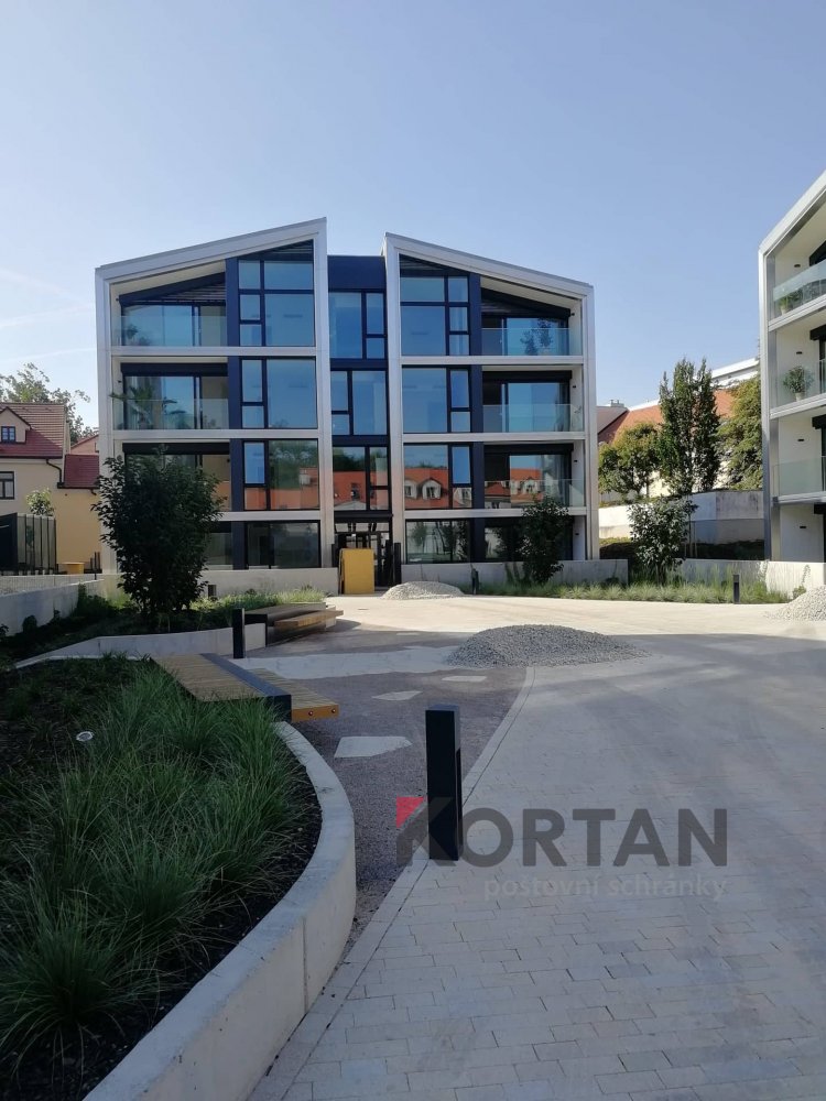 Popis realizace: V roce 2016 jsme uspěli ve výběrovém řízení pro realizaci sestav schránek. Vyrobili jsme sestavy schránek dle požadavků architekta a doplnili sestavy schránek o prosklené vitriny, které jsou vyrobeny na míru. Byla použita sestava poštovních schránek určená pro zazdění - použitý typ B-017 (370x110x265) v RAL 7016 matná nestandard, orámování celé sestavy Al L profilem 20/20/2mm v barvě 7016 standard. Sestavy schránek byly doplněny o vitriny s posuvným zasklením osazené zámkem. Vitriny slouží k vyvěšení informací obyvatel domu, zadní strana je tvořena magnetickým plechem lakovaným RAL 9010.