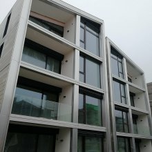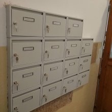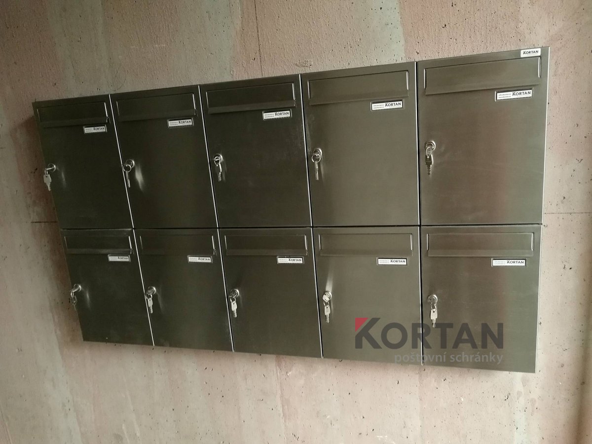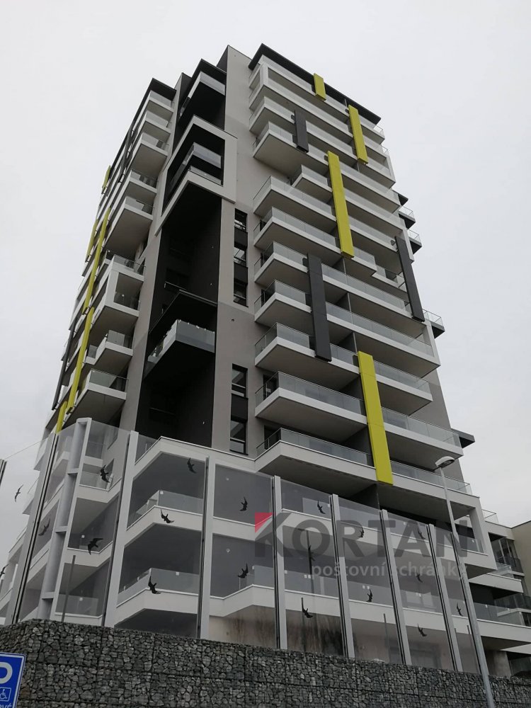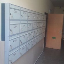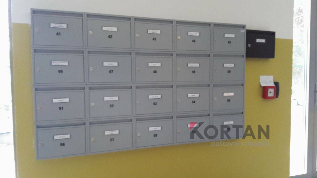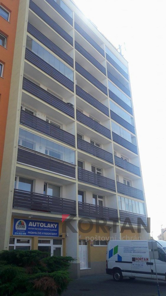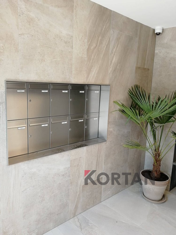 Popis realizace: V roce 2016 jsme uspěli ve výběrovém řízení pro realizaci sestav schránek. Vyrobili jsme sestavy schránek dle požadavků architekta a doplnili sestavy schránek o prosklené vitriny, které jsou vyrobeny na míru. Byla použita sestava poštovních schránek určená pro zazdění - použitý typ B-017 (370x110x265) v RAL 7016 matná nestandard, orámování celé sestavy Al L profilem 20/20/2mm v barvě 7016 standard. Sestavy schránek byly doplněny o vitriny s posuvným zasklením osazené zámkem. Vitriny slouží k vyvěšení informací obyvatel domu, zadní strana je tvořena magnetickým plechem lakovaným RAL 9010.