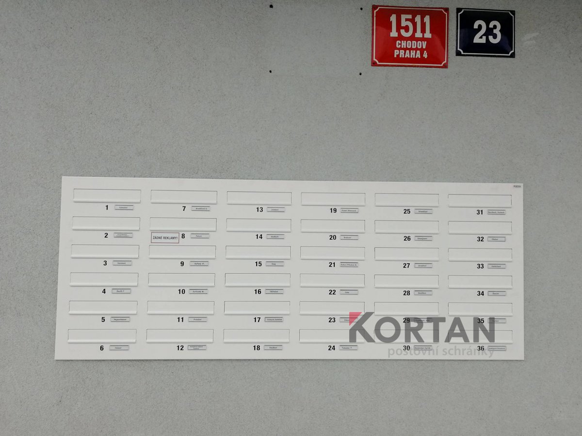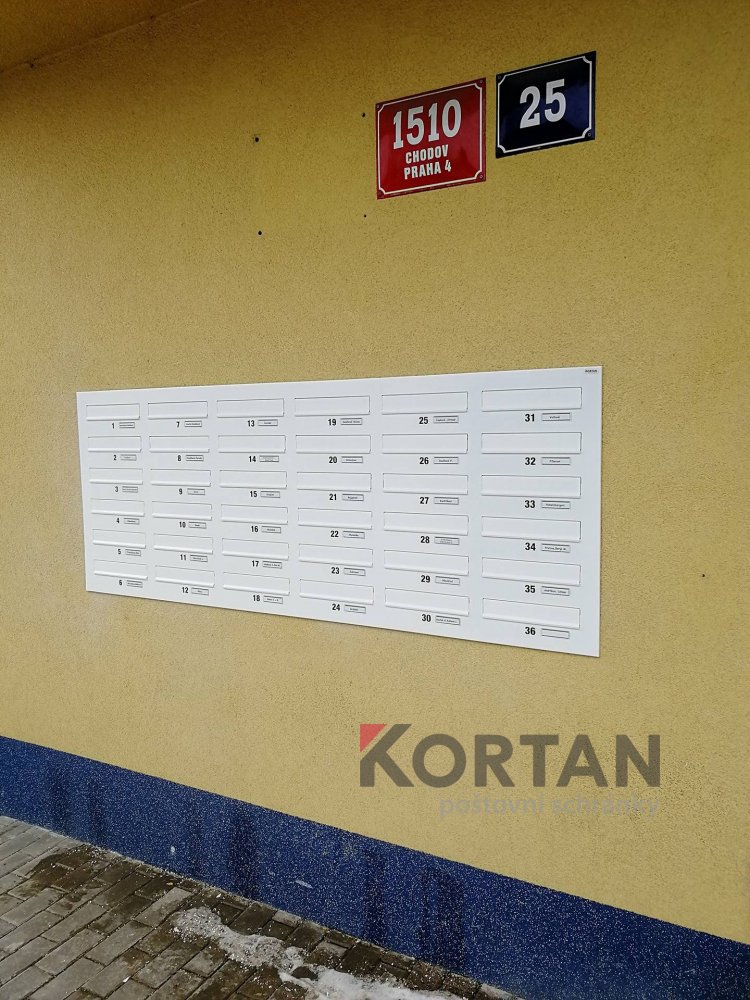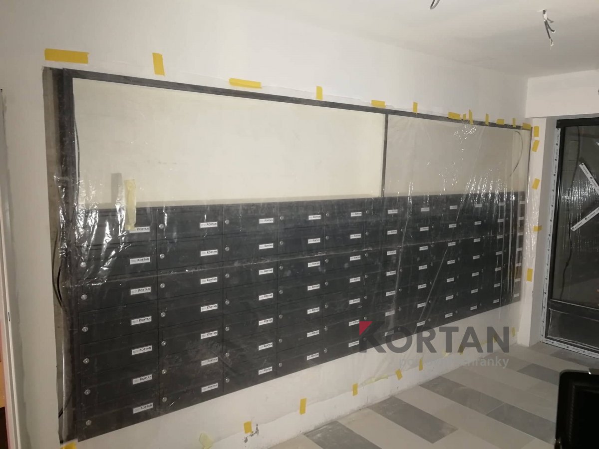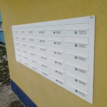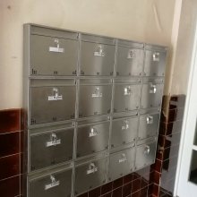 Popis realizace: Pro SVJ v Praze na ul.Křejpského jsme instalovali sestavy schránek určené pro zazdění. Zvolený typ schránky B-04 (300×110×385). Sestavy jsou uspořádány do 6 sloupců x 6 řad. Sestava je průchozí - vhoz zepředu a výběr zezadu. Sestava je doplněna o čelní hliníkovou deskou, do které jsou integrovány Al vhozové sklapky a plastové jmenovky 74\22mm. Na přání zákazníka jsme osadili schránky papírovými jmenovkami a čísly. Zakázka v počtu 4 ks sestav je již v pořadí druhá na této adrese.
