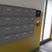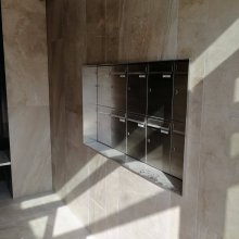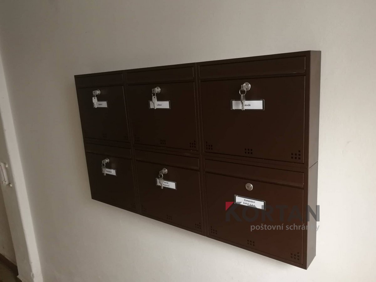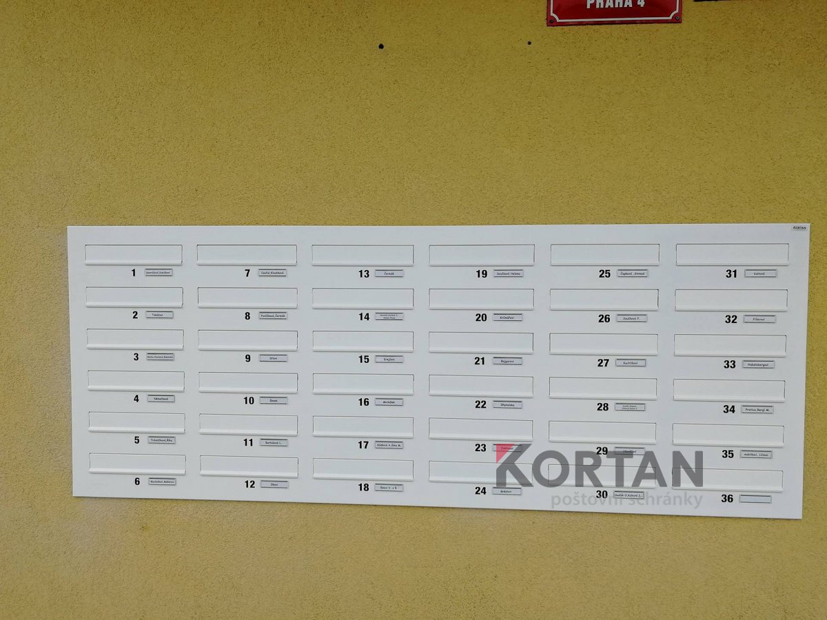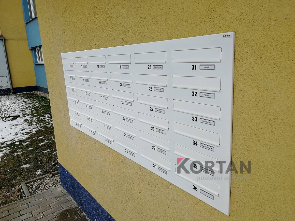 Popis realizace: Pro SVJ v Praze na ul.Křejpského jsme instalovali sestavy schránek určené pro zazdění. Zvolený typ schránky B-04 (300×110×385). Sestavy jsou uspořádány do 6 sloupců x 6 řad. Sestava je průchozí - vhoz zepředu a výběr zezadu. Sestava je doplněna o čelní hliníkovou deskou, do které jsou integrovány Al vhozové sklapky a plastové jmenovky 74\22mm. Na přání zákazníka jsme osadili schránky papírovými jmenovkami a čísly. Zakázka v počtu 4 ks sestav je již v pořadí druhá na této adrese.