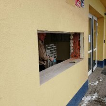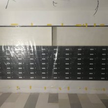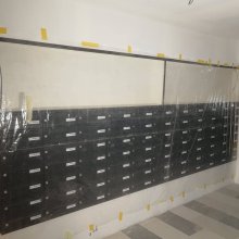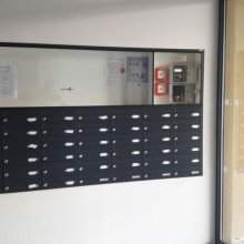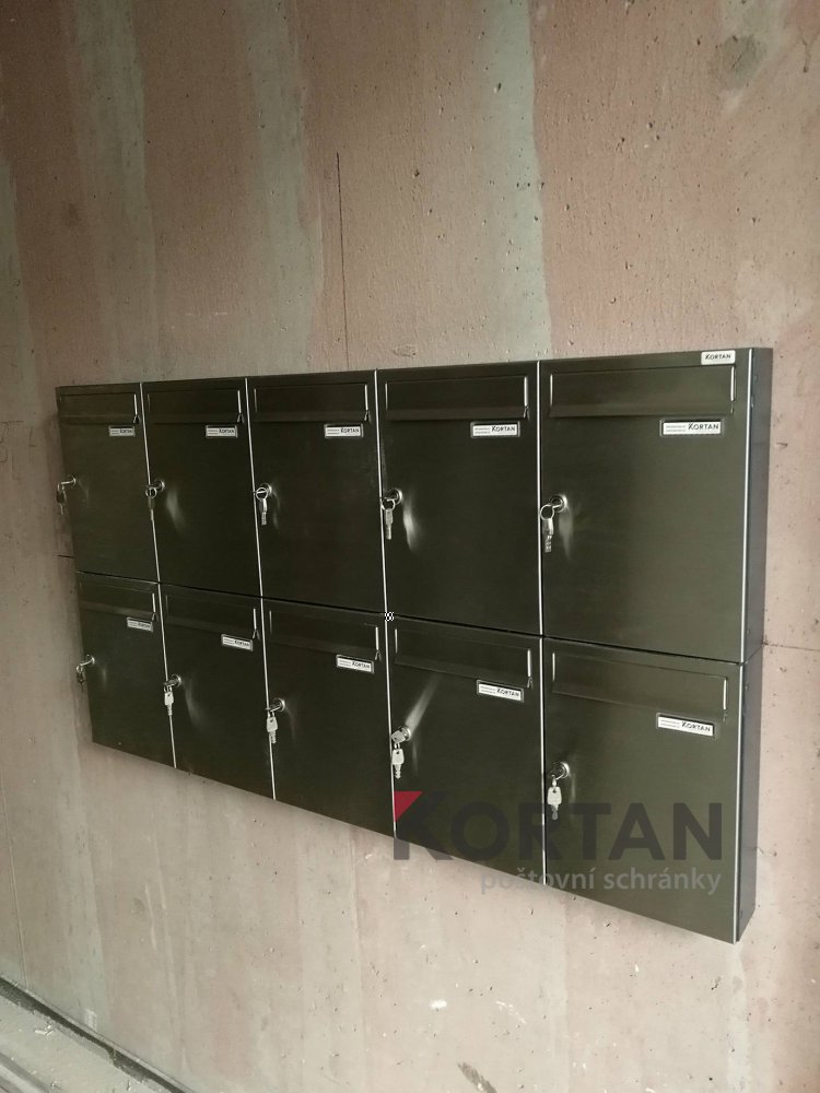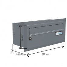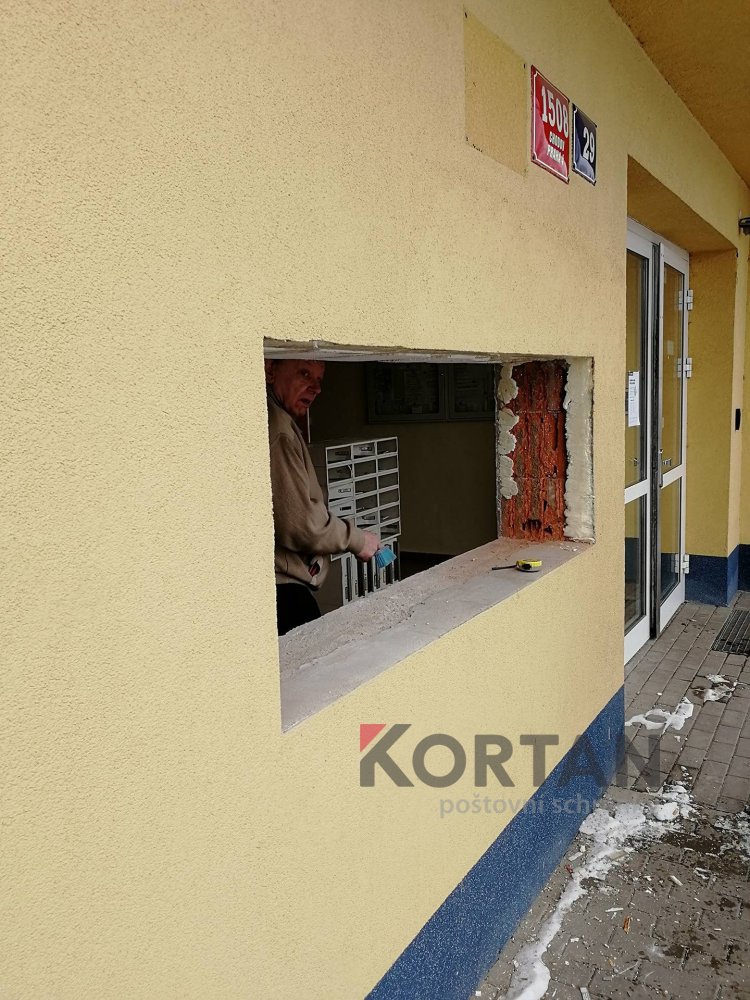 Popis realizace: Zvolený typ schránky B-015 (370x150x265) v barvě RAL 7016 antracit. Pro stavební firmu jsme vyrobili a namontovali schránkovou sestavu určenou pro zazdění z DLS B-015 v uspořádání 11 sloupců x 7 řad. Součástí sestavy je vitrina s posuvnými skly. Sestava je orámována Al L profilem 20/2mm v RAL 7016 standard. Bylo zapotřebí vyrobit ocelové nosné konzoly na kterých je ukotvena setava schránek. Provedli jsme montáž sestavy schránek následovalo opláštění sádrokartonem. Schránka ležatá, vhoz i výběr vpředu, určena do exteriéru i interiéru. Lakované provedení.