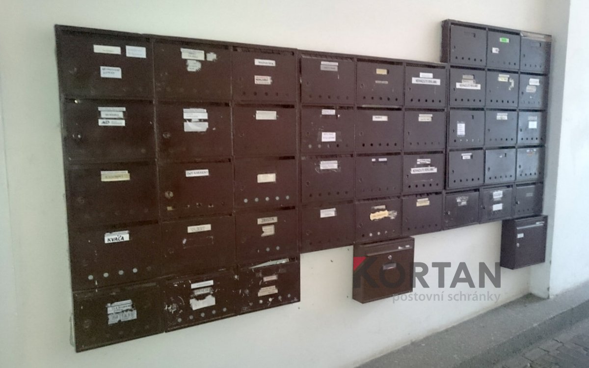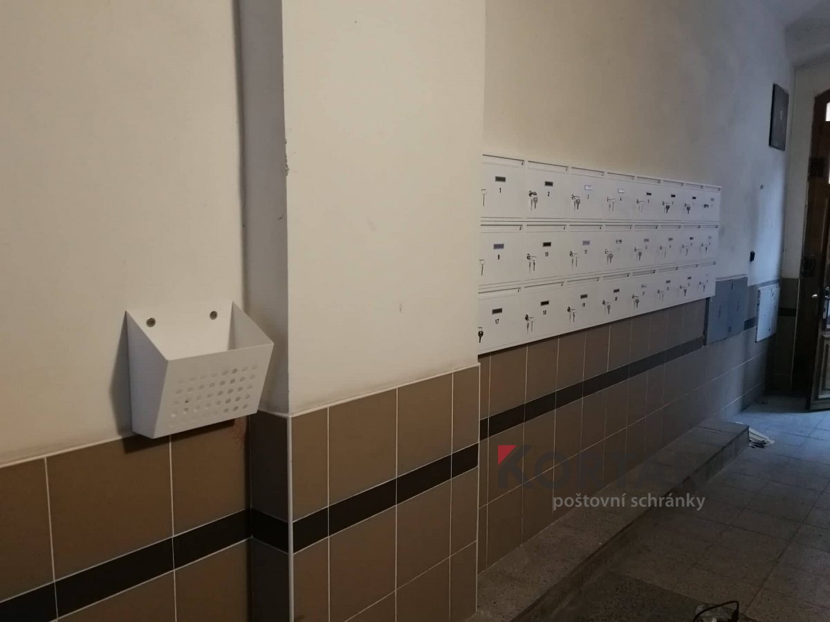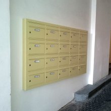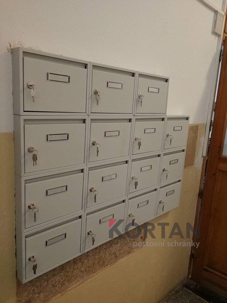 Popis realizace: Montáž malé nástěnné sestavy poštovních schránek - typ E-01 v uspořádání 4x4, barva RAL 035. Realizace byla provedena v Praze, nám. Dr.Holého 8.uspořádání 4×4-1ks.Barva 7035.