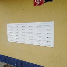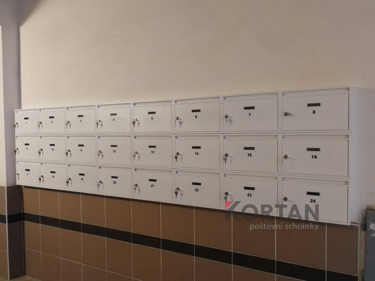 Popis realizace: Namontovali jsme nástěnnou schránkovou sestavu bez orámování z DLS G-01BASIC (8 x 3) v RAL 9016. Původní schránky jsme demontovali a následně namontovali novou sestavu. Zákazník zvolil typ G-01 BASIC Sestava z 24 ks DLS G-01basic - sestava nástěnná bez orámování. Sestava nástěnná z DLS G-01 Basic (385 x 260 x 80) schránky stojaté, vhoz i výběr vpředu.
