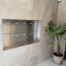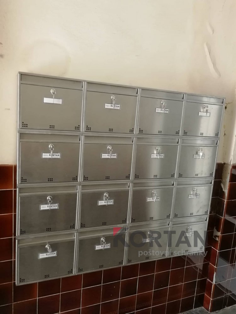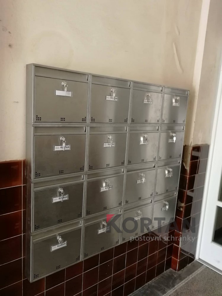 Popis realizace: Pro našeho klienta jsme v Praze realizovali sestavu nerezových schránek. Použita byla schránková sestava nástěnná neopláštěná z DLS H-012(360x310x90) v provedení broušená nerez. Uspořádání sestavy do 4 sloupců x 4 řady. Jedná se o velmi oblíbenou schránku pro bytové domy a paneláky.