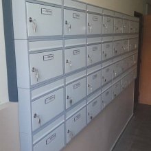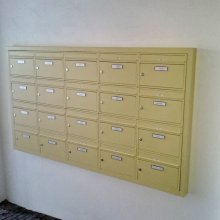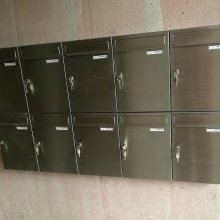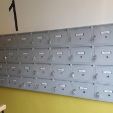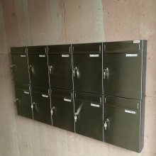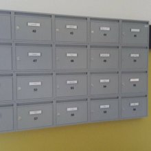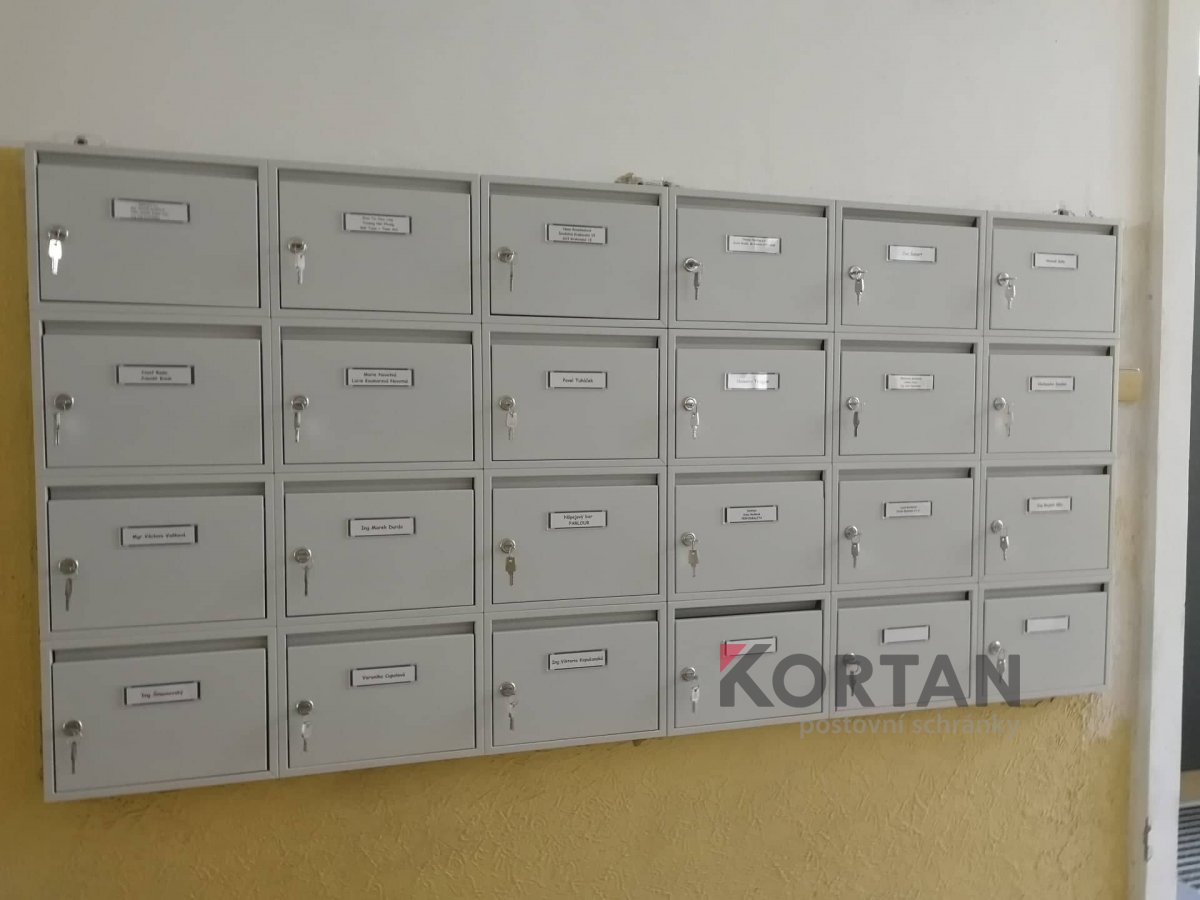 Popis realizace: Pro našeho zákazníka z Prahy jsme realizovali schránkovou sestavu - nástěnná sestava bez opláštění z DLS E-01(325x240x60), uspořádání 6 sloupců x 4 řady, barva RAL 7035 matná standard.