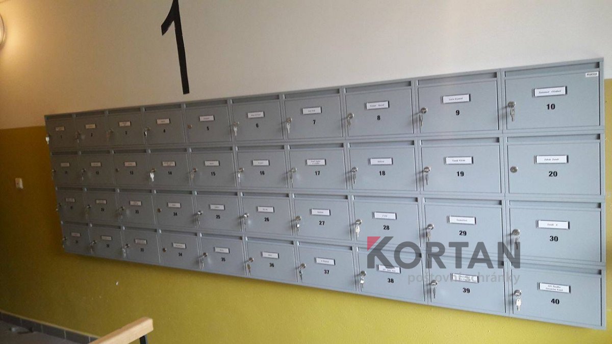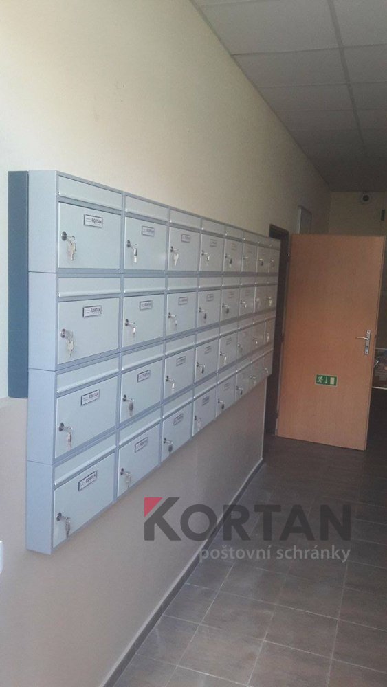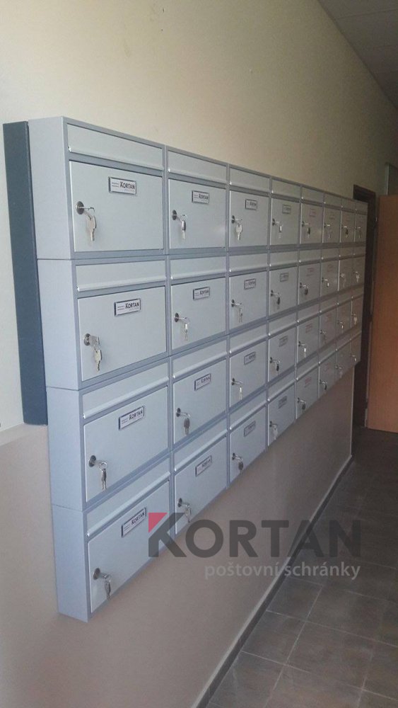Popis realizace: Pro našeho zákazníka jsme v Praze realizovali nástěnnou schránkovou sestavu bez opláštění z DLS B-01(300x110x385) v uspořádání 5 sloupců x 7 řad, barva RAL 7035 matná standard. Sestava schránek je podepřena lakovanou ocelovou nosnou konzolou JPU 40/40/2mm. Na přání zákazníka jsme schránky osadili jmenovkami obyvatelů domu.