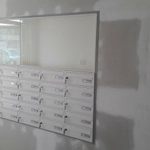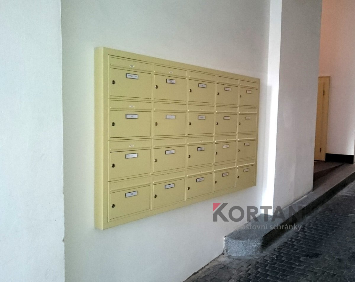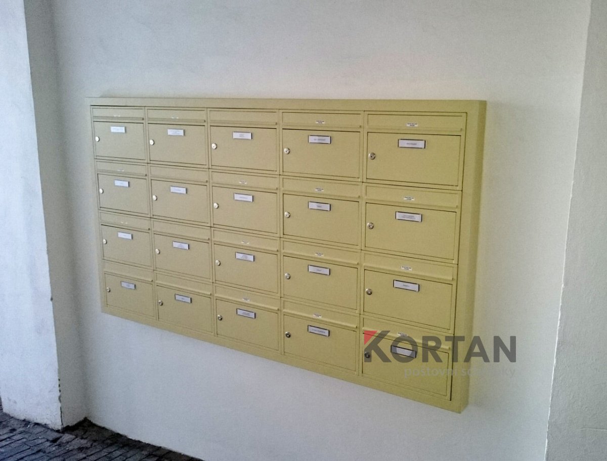 Popis realizace: Realizace nástěnné orámované sestavy schránek, typ G-01 (385 x 260 /80mm). Tyto schránky požadoval zákazník orámovat ocelovým profilem 40/80/2 mm. Barevné provedení je ve standardní barvě RAL 1014 (slonová kost) včetně rámu. Uspořádání 5 sloupců x 4 řady, rozměr celé sestavy schránek včetně ocelového profilu je 1965 x 1080 mm (š x v). Díky orámování působí sestava schránek uceleně.